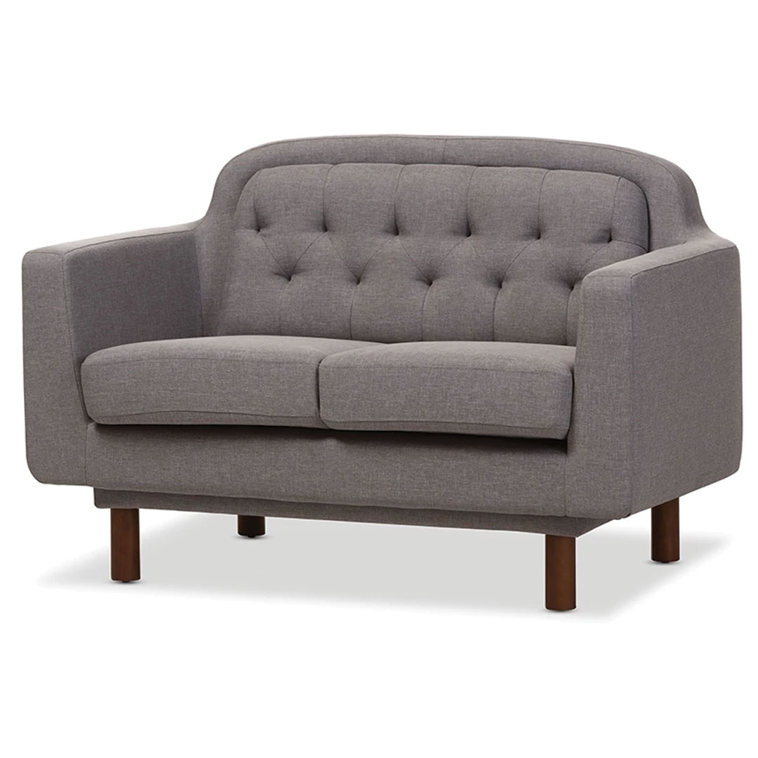 Elevate your living space with the kivona Virginia Mid-Century Love Seat. This stylish piece combines retro charm with modern comfort, making it a perfect addition to any contemporary home. The love seat features a sleek silhouette, clean lines, and plush cushioning, providing a cozy spot for relaxation. Upholstered in high quality fabric, it showcases distinctive button tufting and elegant wooden legs that enhance its mid century aesthetic. Ideal for small spaces or as a chic complement to larger seating arrangements, the Virginia love seat brings a touch of sophistication and warmth to your decor.