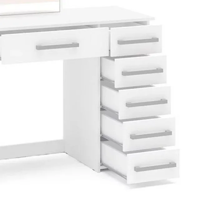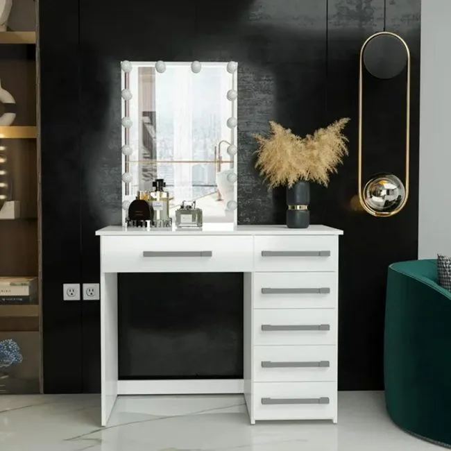 Enhance your beauty routine with the TN Interiors Modern Lighted Makeup Table with Mirror. This chic and stylish makeup table features built in lighting that provides perfect illumination for applying makeup or grooming. Its sleek design and spacious tabletop offer ample room for all your cosmetics and beauty essentials, while the elegant mirror adds a touch of sophistication to your space. Crafted from high-quality materials, this makeup table is both functional and fashionable, making it an essential addition to your bedroom or dressing area.