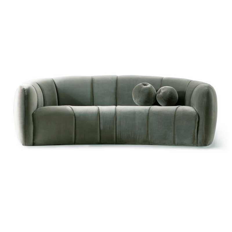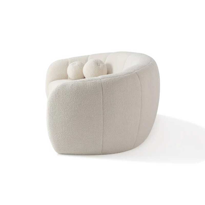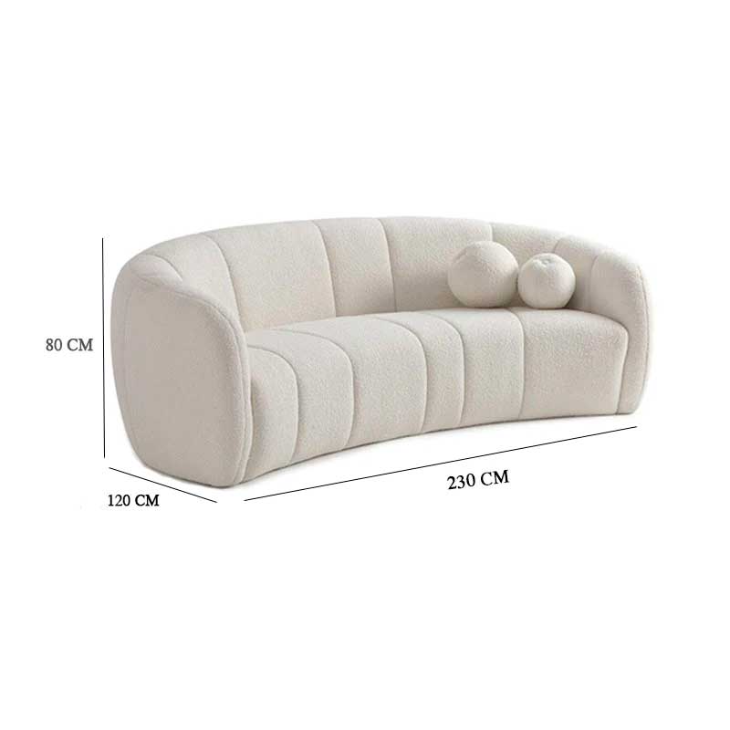 The TN Interiors Vertical Channel Tufted Curved Sofa is a stylish and cozy centerpiece for any living space, embodying a modern and minimalist aesthetic. Its gracefully curved design, accentuated by vertical channel tufting, creates an inviting, elegant flow. Upholstered in soft matte velvet and luxe boucle fabric, this sofa is as comfortable as it is visually captivating. It includes two mid-century orb pillows for added charm and a touch of whimsy.